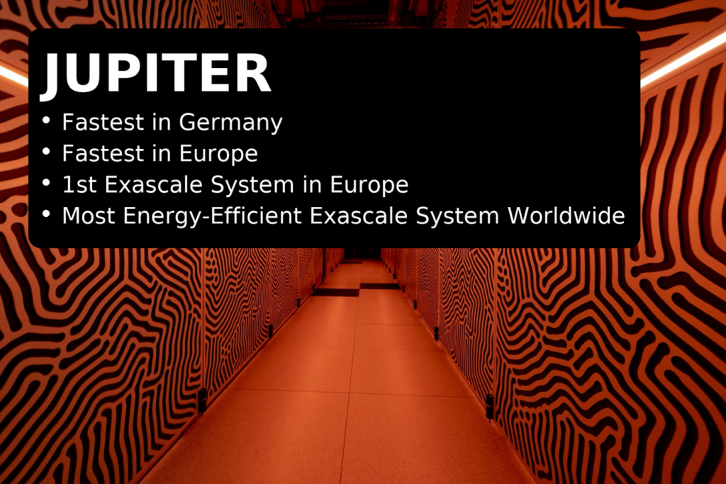 JUPITER “Joint Undertaking Pioneer for Innovative and Transformative Exascale Research”, at Research Centre Jülich is the first European supercomputer in the exascale class, delivering a computing power of more than one quintillion floating-point operations per second. JUPITER achieves one double precision (64 bit) ExaFLOP/s with typically required for scientific simulations.